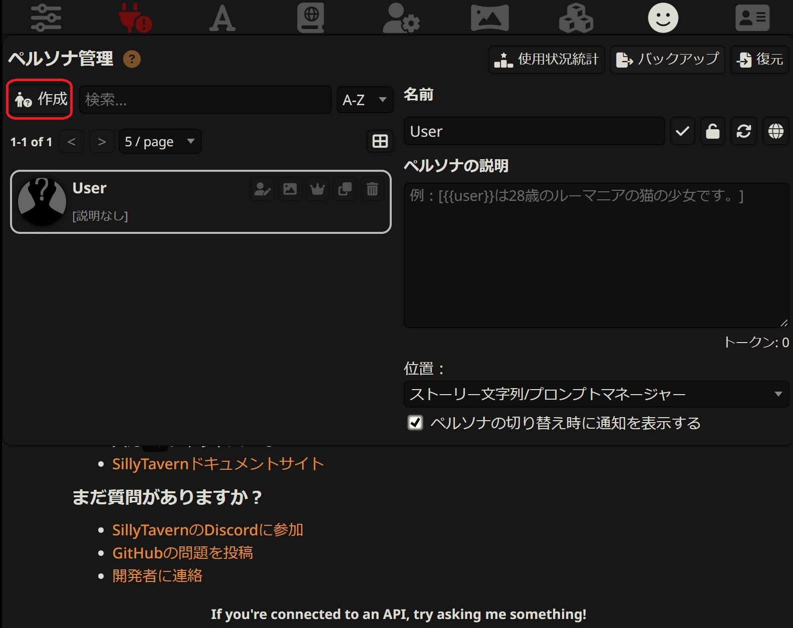 キャラクター設定の書き方などは【ローカルLLM】SillyTavern向けプロンプト記述方法などページをご覧ください。